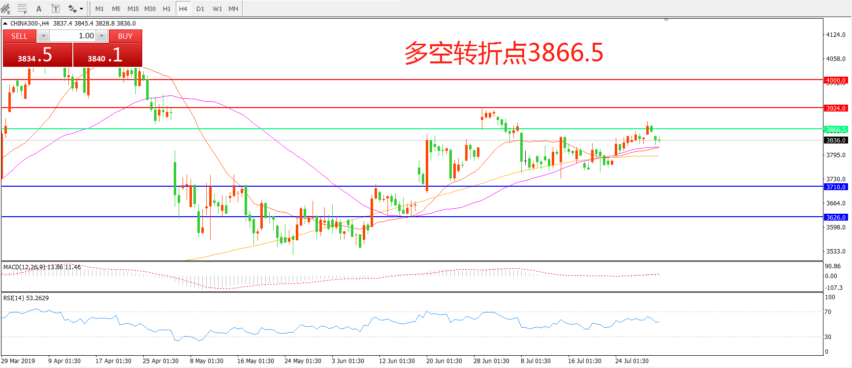 4小时图看,沪深300指数呈现弱智震荡走势,但仍然站在均线支撑之上,RSI指标走平,日内若能突破3866.5一线阻力,整体将进一步上行。