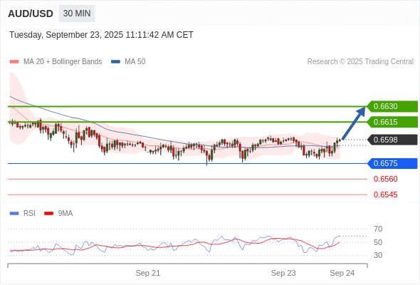 在 0.6575 之上,看涨,目标价位为 0.6615 ,然后为 0.6630 。
