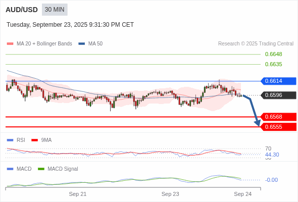 澳元/美元 当日内 : 看跌,在 0.6614 之下。