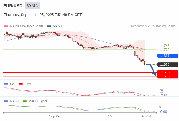 技术点评: RSI技术指标小于30。在这种情况下,说明有很强的下跌趋势,或者意味着处在超卖的状态下,可能会有向上的反弹。我们将观察RSI技术指标是否出现背离现象。 MACD技术指标处在其信号线之下看空。 配置为负。 此外,价位低于其20天及50天移动平均线 ( 分别位于1.1711 和1.1730 )。