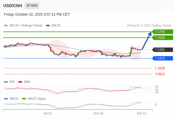 备选策略: 如跌破 7.1223 ,USD/CNH 目标方向定在 7.1029 和 7.0913 。