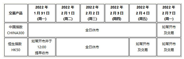 因应2022年1月31日至2月6日期间为国内及香港农历新年假期,本公司以下产品的交易时间将于假期期间作以下安排,敬请留意。